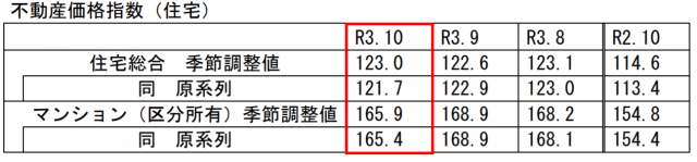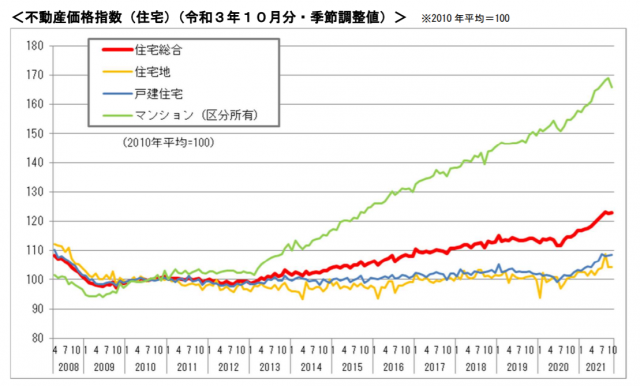 国土交通省は1月31日、2021年10月分の不動産価格指数(季節調整値)を公表した。2010年平均を100として算出したもので、全国の住宅総合は前月比0.3%増の123.0となった。住宅地は同0.1%減の104.2、戸建住宅は同0.3%増の108.7、マンション(区分所有)は同1.8%減の165.9だった。
