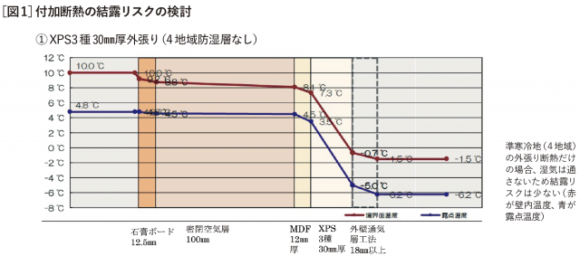 ◉グラスウールの充填断熱に付加断熱を行う場合、結露に対して安全性が高いのが発泡プラスチック系断熱材を用いた付加断熱だ。比較対象として4地域におけるXPS3種30mm厚の外張り断熱の結露リスクをシミュレーションする。XPSは断熱層に水蒸気が移行しないので防湿層なしでも結露に対して安全側だと分かる[図1①]
