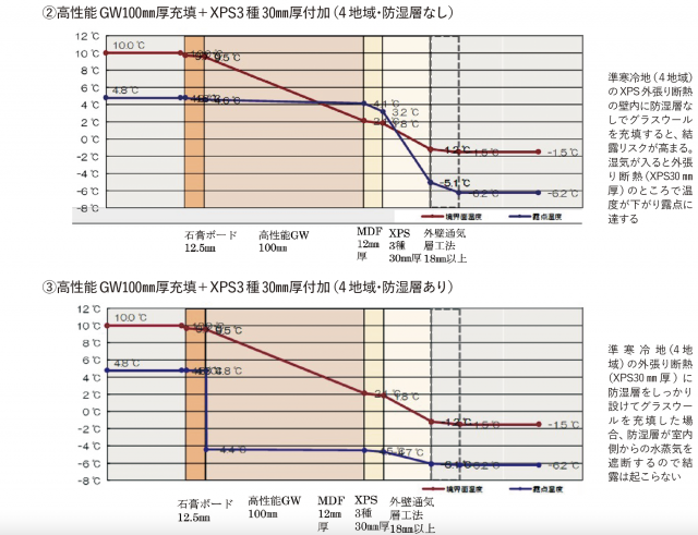 ◉次に4地域でグラスウールの充填断熱にXPS3種30mm厚を付加断熱した結露リスクを見る。防湿層なしだと結露を起こすが[図1②]、防湿層を設けると結露は生じない[図1③]