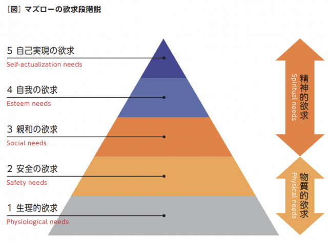 アメリカの著名な心理学者のアブラハム・マズローが唱えた「欲求段階説」によると、人間の欲求には、1生理的欲求、2安全の欲求、3親和の欲求、4自我の欲求、5自己実現の欲求―の5段階があり、下位の欲求を満たすとより上位の欲求を満たしたくなるのだという(図)。