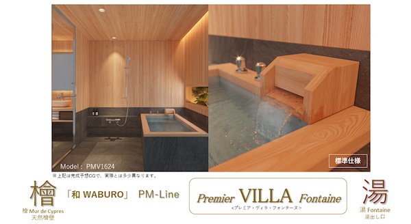 新商品の「WABURO Premier VILLA Fontaine(ワブロ・プレミア・ヴィラ・フォンティーヌ)」には、十和田石の石張り浴槽、ヒノキの浴槽框、ヒノキの壁・天井を採用。さらに、温泉宿のようなヒノキの湯出し口も標準装備する。
