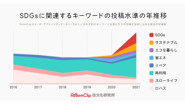 その結果、RoomClipに投稿された「SDGs」や「サステナブル」「再利用」「スローライフ」といったSDGsに関連する写真は、2021年に急増し、投稿水準は2020年に比べると1.8倍に伸長していることがわかった。