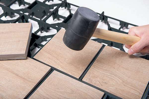 インターロッキングの透水性とタイルのデザイン性を両立する舗装ユニットを独自開発。ポリプロピレン素材の枠材を連結させて、タイルをゴムハンマーで叩いて嵌めるだけで施工が完了する。タイルと枠材の間に隙間ができるため水はけがよく、雨水が地中に浸透していく。駐車スペース、商業施設やマンションの遊歩道などに。