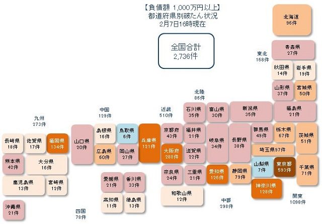 都道府県別(負債1000万円以上)では、東京都が593件と全体の2割強(21.6%)を占め、大阪府288件、福岡県134件、神奈川県128件、愛知県126件、兵庫県121件、北海道96件と続く。10件未満は2県、10~20件未満が11県、20~50件未満が20府県、50件以上100件未満が8道県、100件以上は6都府県に広がっている。