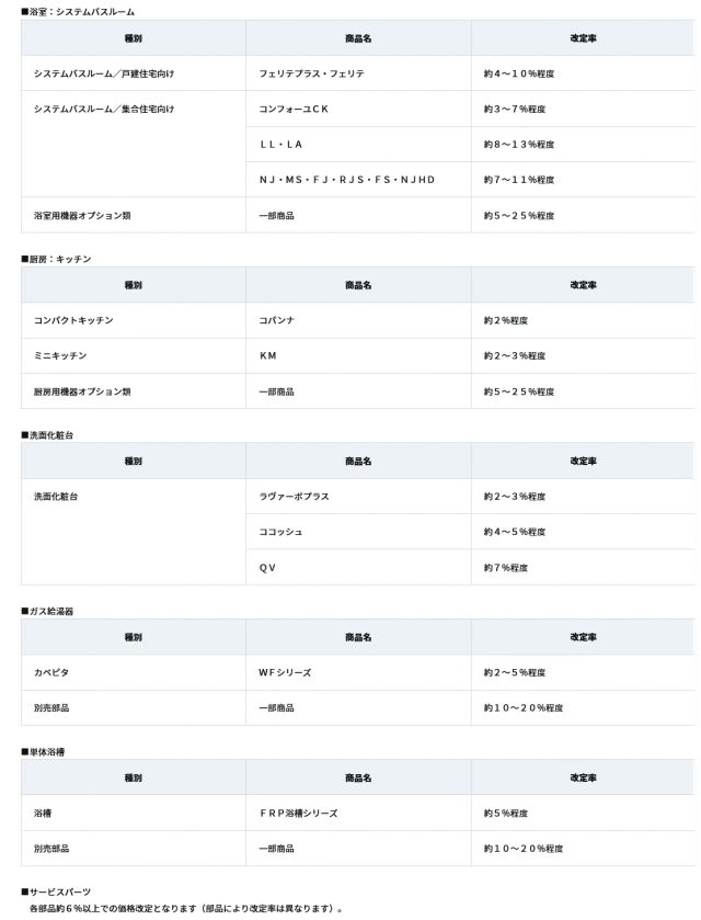 同社HP 〈住宅用設備機器 商品価格改定のご案内〉スクリーンショット