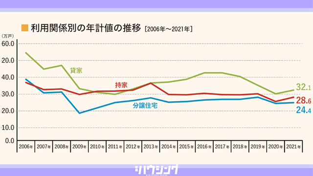 国土交通省は1月31日、2021年の新設住宅着工戸数を発表した。持家、貸家、分譲住宅の全分野で増加し、前年比5.0% 増の85万6484戸となり、5年ぶりの増加となった。過去10年間の水準でみると、最も低かった昨年に次ぎ下から2番目と低調。
