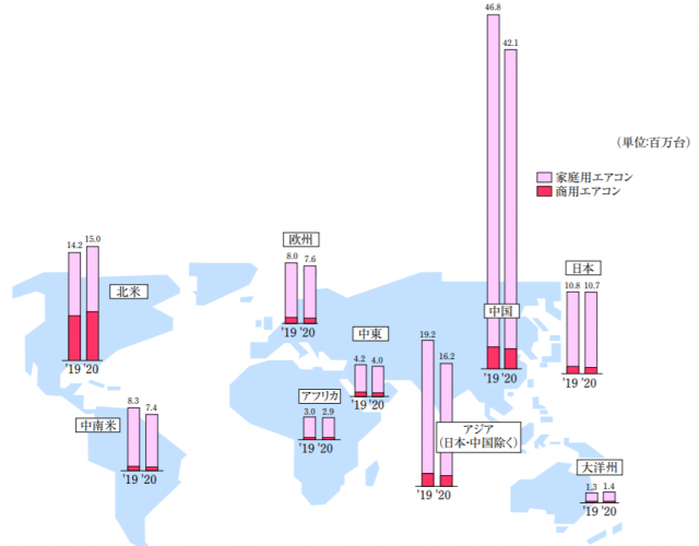 一般社団法人日本冷凍空調工業会(東京都港区)はこのほど、2019年、2020年の世界各国のエアコン需要推定をとりまとめた。
