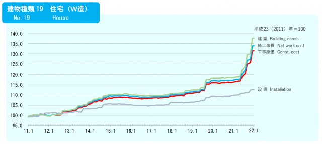 建設物価調査会は2月10日、建設物価建築費指数(2011年に東京で建築された建物の平均を100とする)の2022年1月分をまとめた。