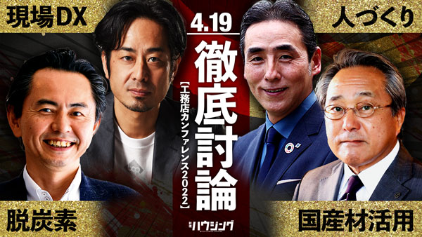 「社会から求められる工務店」を実現するための具体的な要件として、脱炭素型の家づくりや国産材活用、次世代を担う人づくり、現場DXの4つのテーマを掲げ、ディスカッションを通じてカネと仕組みに迫りながら、実践手法を提示します。