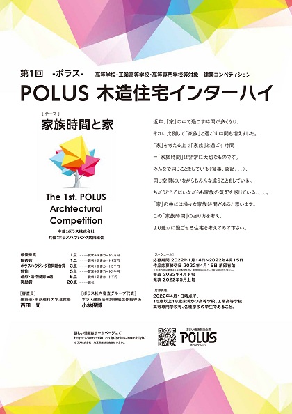 ポラス(埼玉県越谷市)は、高等学校・工業高等学校・高等専門学校等対象の建築コンペティション「第1回POLUS木造住宅インターハイ」を開催する。応募登録は4月15日まで。