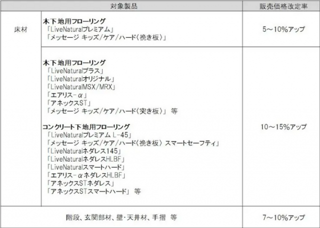 木質材料をはじめとする原材料価格の大幅な上昇や、物流費などの高騰が続くなか、あらゆるコスト削減に取り組んできたが、現状の販売価格を維持するのが困難になったとして、価格改定に踏み切った。対象製品は下記に掲載。