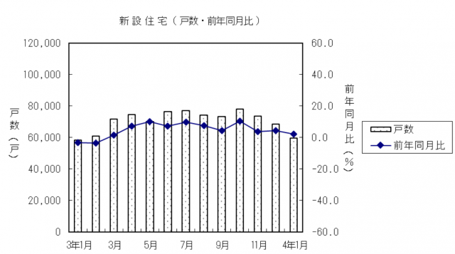 国土交通省が2月28日発表した1月の新設住宅着工戸数は、前年同月比2.1%増の5万9690戸だった。持家と分譲住宅は減少したが、貸家が2ケタ増となり、全体で11カ月連続の増加となった。季節調整済年率換算値では前月比2.1%減の82万戸で3ヶ月連続の減少。