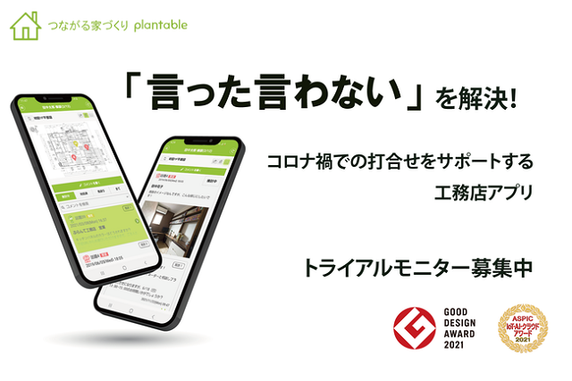 今回、plantableをより多くの工務店に認知、使用してもらうことで、家づくりに関わる全ての人が安心して家づくりを進め、ウィズコロナ、アフターコロナを乗り切ってもらいたいという思いから、トライアルモニターキャンペーンを実施。先着10社限定で、登録物件3棟まで1年間無料でアプリを使用することができる。利用した感想などは、サービスのバージョンアップや追加機能の開発などにも活用する予定。