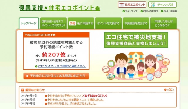 国土交通省と環境省は6月19日、被災地以外の地域での住宅エコポイントの予約受け付けを7月中旬にも終了すると発表した。被災地については、10月末をめどに予算額に達するまで受け付けを続ける。