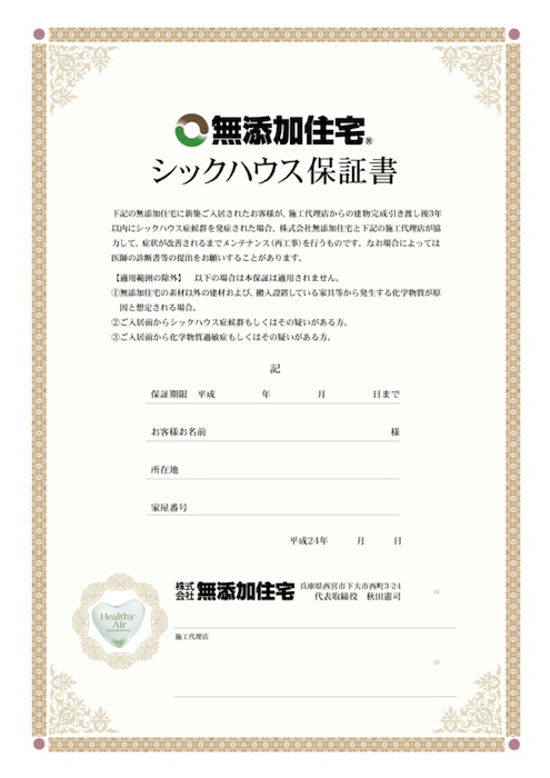 無添加住宅(兵庫県西宮市)は約130ある代理店全店において、住宅の建物全体を対象とした「シックハウス保証」を6月1日にスタートした。