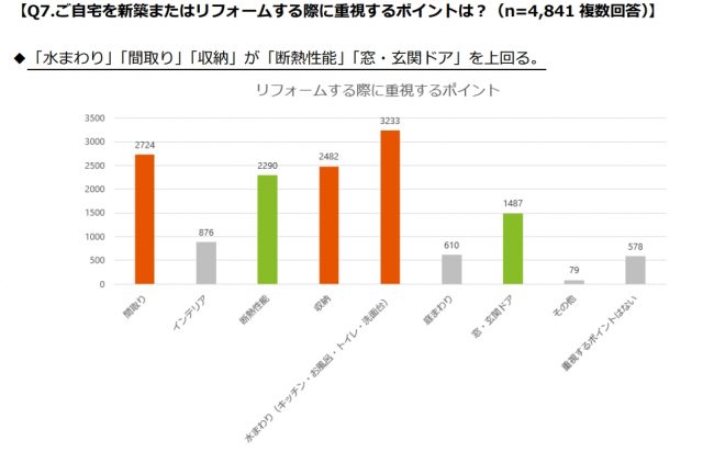 LIXIL(東京都江東区)は3月8日、全国の20代~60代の既婚男女4841人(各都道府県103人)を対象に実施した、住まいの断熱に関する意識調査の結果を発表した。それによると、家の断熱性能に「関心がある」人は68%に上った。また、自宅の断熱性能が「あまり十分ではない」「十分ではない」と回答した人は41%、実際に冬の自宅で寒さを感じる人は65%に上ったが、断熱リフォームを検討したこともない人は80%と、断熱への関心が高く、自宅の断熱性能が十分でないと感じている人が多い一方で、断熱リフォームの検討をした人は少なく、断熱リフォームが身近な選択肢にないことがうかがえる結果となった。実際に、自宅を新築・リフォームする際に重視するポイントは、「水まわり」「間取り」「収納」が「断熱性能」「窓・玄関ドア」を上回った(下グラフ)。