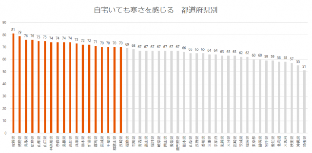 また、冬になると自宅で寒さを感じる人は、都道府県別では徳島県、鳥取県、広島県、奈良県、兵庫県、和歌山県など、中国・四国地方や関西地方といった比較的温暖な西日本エリアに集中していることがわかった(下グラフ)。