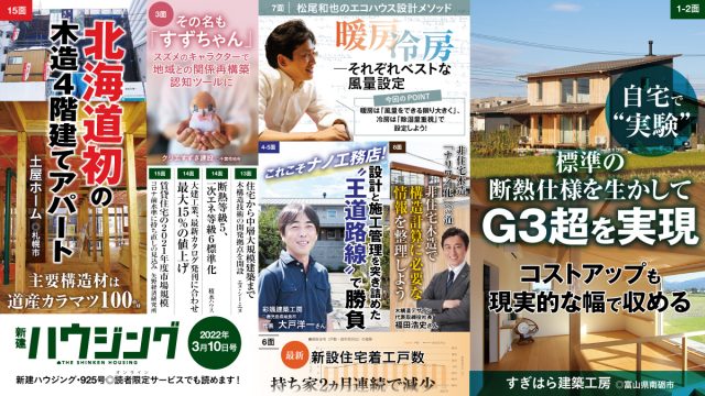 新建ハウジング最新3月10日号のトップ記事は、すぎはら建築工房(富山県南砺市)の社長・杉原賢磁さんが昨年2月、HEAT20・G3を超える高断熱な自宅「松原の家」を、自ら設計して市内に建築した事例を特集します。