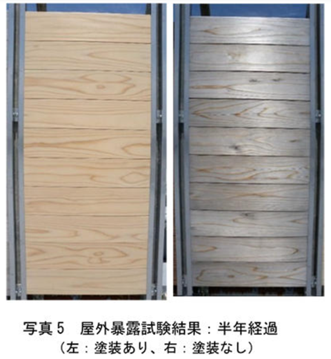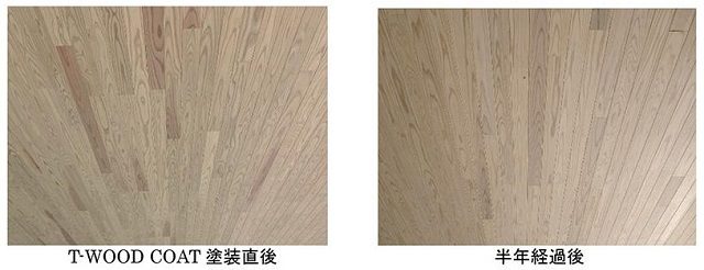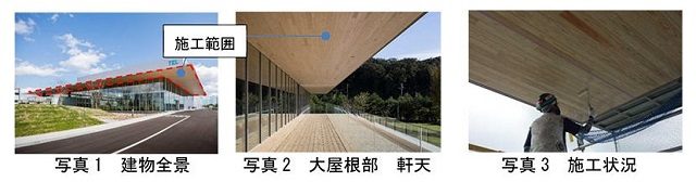 同塗料は、従来の木材保護塗料と同様の方法、日程で施工した。乾燥時間が夏期1~2時間程度、冬期5~6時間程度と短いため、天候条件の影響を軽減でき、施工性を向上。クリヤ色で、地域産杉材(南三陸杉)の色味や木目の美観性をそのまま生かし、半年経過後も施工当初の状態で意匠性を保持している。屋外暴露試験では、未塗装の外装材よりも「T-WOOD COAT」を塗装した方が半年後も美観を保持しており、耐久性に優れていることが確認できた。
