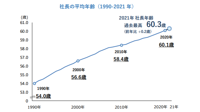 2021年の社長の平均年齢は60.3歳で、前年比+0.2歳となった。調査を開始した1990年以降右肩上がりの状況が続き、31年連続で過去最高を更新した。