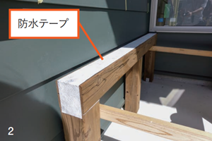 高温処理木材は「サーモウッド」や「エステックウッド」といった商品名で流通している。どちらも規格品だ。山口さんはスギのエステックウッドを採用している。サーモウッドより大引や束などの寸法体系が山口さんの設計になじむためだ。30mm厚の材を無塗装で用いている。水が滞留する可能性のある束の木口面や大引とデッキ材の接触面に片面タイプの防水テープを貼って水が入るのを防いでいる。