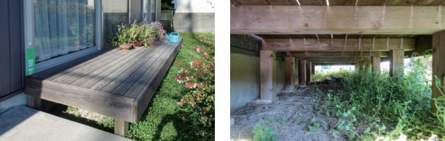 山口さんはリビングなどの掃き出し窓の先にウッドデッキを設け、室内と外部をつないで開放感をもたせる設計が多い。ウッドデッキは水平に木板を設置するため雨をまともに受けて水が滞留しやすいため、木板が早期に傷みやすい。一般にはハードウッド(南洋材)や木粉と樹脂の押出し成形版が多用される。これらの材は夏場に熱を蓄えて表面が熱くなり、裸足で外に出られなくなる。また、南洋材は材質が固く、ビスを打つのに下穴が必要となり、ささくれも出やすい。そして押出し成形版は木材の質感も乏しい。
