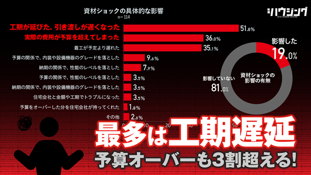 資材ショック(木材・建材・設備機器の価格上昇、納期遅延)の影響を受けたのは、600人中114人。全体の19.0%を占めた。回答者の住宅取得は直近2年間なので、新型コロナ感染拡大初期に発生した設備機器の納期遅延や、昨年のウッドショックなどの影響も含まれると思われる。