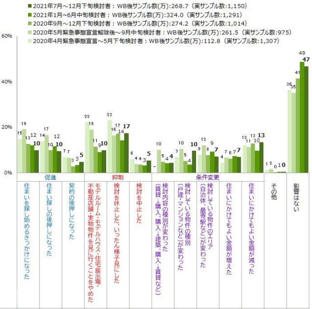 新型コロナウイルス感染症拡大が、住まい探しに影響を及ぼしたか尋ねたところ、2021年7月~12月の検討者の約半数が「影響はない」と回答。コロナ拡大が始まった当初(2020年4月~5月下旬検討者)と比べると、「影響はない」の割合は11ポイント上昇した。