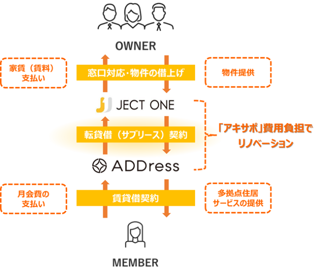 従来、ADDressへ物件登録する際は、物件オーナーとADDress間で転貸借(サブリース)契約を結ぶが、今回の連携ではジェクトワンとADDress間で転貸借契約を締結。ジェクトワンは物件オーナーとの窓口対応および物件の借上げを行い、「アキサポ」サービスによって外壁、屋根、ファサードサッシ、内部解体、電気工事、給湯器交換等のリノベーション工事と家具・家電費用を負担する。ADDressは内装工事とインテリアデザインを担当する。