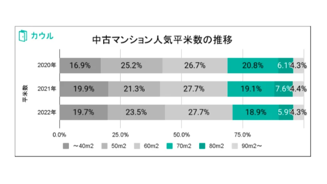 中古マンションの売却ができるアプリ「カウル」を運営するHousmart(東京都中央区)はこのほど、同アプリの登録会員を対象に、2020年~2022年それぞれの1~2月時点の中古マンションの希望間取りと広さの推移を調査した。