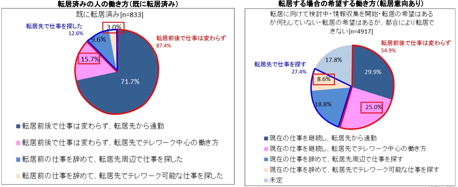 一方、転居希望者の働き方の意向を見ると、「転居先から現在の仕事場に通勤」が29.9%、「現在の仕事でテレワーク中心」が25.0%、「転居先周辺で仕事を探す」18.8%、「転居先でテレワーク可能な仕事を探す」8.6%だった(下グラフ)。