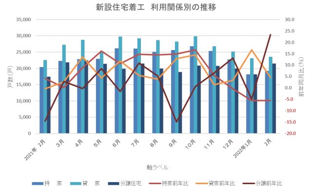 持家は前年同月比5.6%減の1万9258戸。2月の数値としては、1963年(昭和38年)2月以来の低さとなり、3カ月連続の減少となった(1963年2月は1万6978戸)。昨年8月~9月にかけて発出された緊急事態宣言で住宅展示場集客が減少したことが大きく影響した。同省は、ウッドショックの主だった影響については統計上からは見られないとしているが、今後ロシア・ウクライナ情勢でロシア産木材の流通が滞るなどの事態が起きれば、着工にも影響が出るとして注視していくとした。