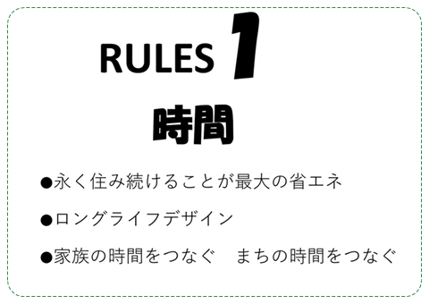 まず、時間のルール。例えば、永く住み続ける事が最大の省エネルギーだと仰っています。そこから発展してロングライフデザイン、それがとても重要なんだと。ドミノにもロングライフデザインが挙げられています。家族の時間を育む時間を繋ぐ、ということで、たとえば30年で壊すような家じゃだめです。