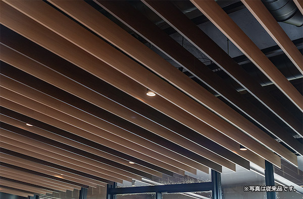 エービーシー商会(東京都千代田区)は、天井・壁に施工できるアルミ素材の片流れルーバー「インターライン」シリーズに木目調2商品を追加した。