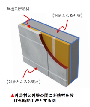 外装材と下地となる外壁の間にロックウール、グラスウールその他の不燃材料(無機系物質で構成されたもの)である断熱材を設けること