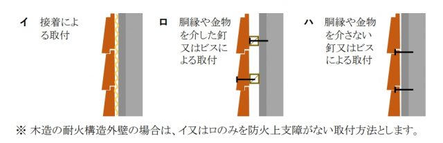 くぎ、ねじその他の金物又はモルタルその他の接着剤で外壁に緊結すること。ただし、下地が木材である耐火構造の外壁にくぎ等で緊結する場合は、外装材と外壁は胴縁等を介して取り付けるものとし、外装材を取り付けるためのくぎ等は、外壁の下地部分に触れないものとすること
