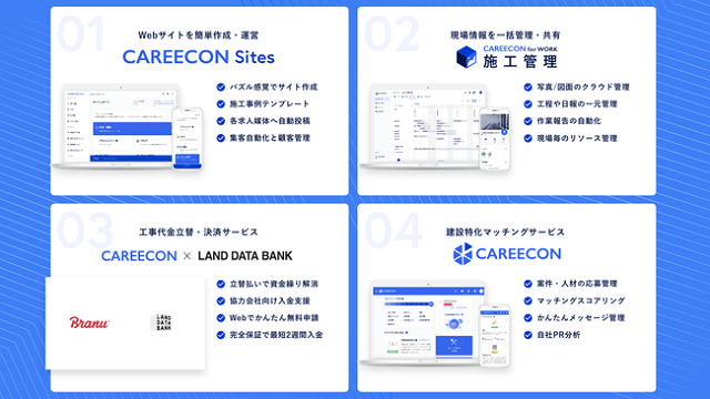 これからDXを推進していきたい建設中小企業向けのスターターパックで、同社が提供するノーコードWebサイト管理ツール「CAREECON Sites」、クラウド施工管理ツール「CAREECON for WORK 施工管理」、工事代金立替決済サービス「CAREECON × LAND DATA BANK」、建設業に特化したマッチングサービス「CAREECON」を利用可能。クラウド上で、集客・採用を目的としたデジタルマーケティング、現場の施工管理、協力業者や仕事のマッチング、売掛金早期現金化を行えるため、業務効率化や人材獲得、安定経営などを実現できるという。