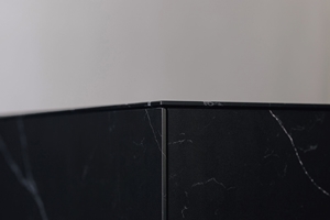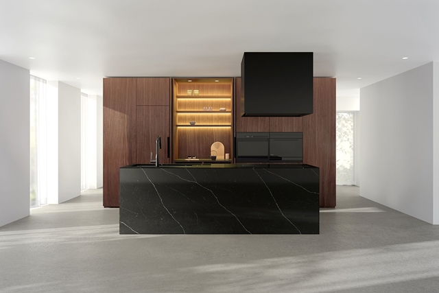 「キッチンは使わない時間の方が長い。だからこそ、その使わない時間のキッチンにはインテリア性が必要。極限まで要素を削ぎ落し、シンプルで美しい佇まいは、まるで”彫刻のようなシルエット”。まさにインテリア家具として存在する」(パナソニック担当者)というキッチンは、扉の柄をつなげることで「面」としての美しさを引き出した。隅やフチも端正に納め、機器も空間に溶け込むようにビルトインした。また作業性や清掃性とも両立。作業スペースには一段下がったデッキ部を設け、水が広がらずに快適に調理や清掃ができるよう設計した。