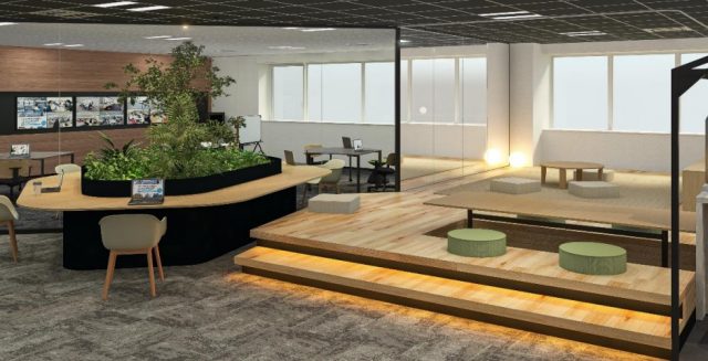 新オフィスは、ノリタケカンパニーリミテドの本社工場跡地にある複合施設「ノリタケの森プロジェクト」(名古屋市西区)内に移転。リモートワークで働く場所に制限がなくなり、オフィスにコミュニケーションのプラットフォームという機能が求められるようになったことから、新オフィスではオープンスペースを8割に拡大。執務室を2割に留め、全国の拠点とリモートで繋がれるようモニターを複数台設置している。オフィス外の社員とも綿密なコミュニケーションが取れるようになっており、同社は「型破りなオフィスから新しいアイデアが生まれる」としている。