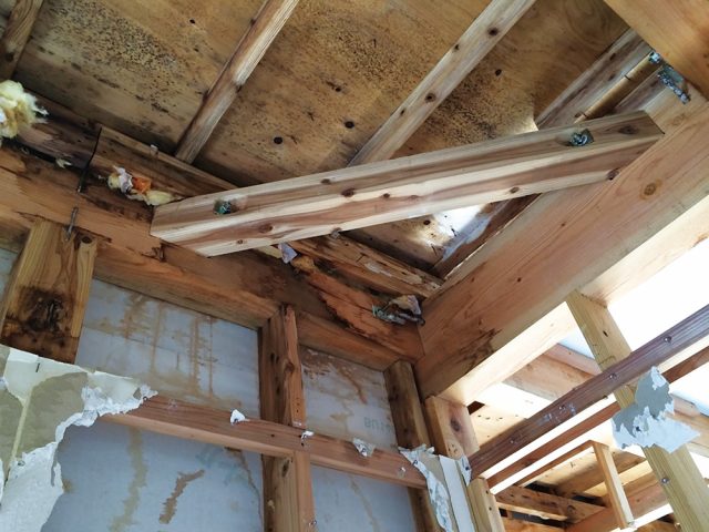 今回は耐久性4大問題の最後である軒ゼロについて解説します。雨漏りは窓まわりで多いものです。しかし、その窓まわりも軒があるのとないのとでは漏る確率に大きな差があります。ある瑕疵担保責任法人が調査した結果は、軒の出が壁芯から15~25cm未満の部位での雨漏りの確率はそれ以上の軒の出に比べて5倍も高かったと出ています。実際に築1年程度で[写真1]のようになる事例が発生しています。