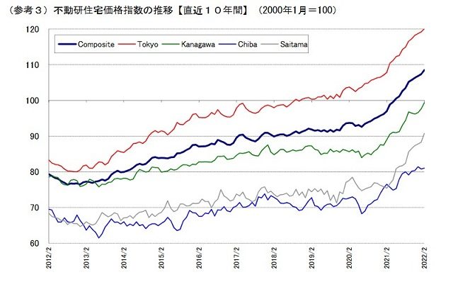 東京都が120.02ポイント(同0.72%増)で22カ月連続、神奈川県が99.33ポイント(同1.75%)で3カ月連続、埼玉県が90.71ポイント(同2.75%)で、12カ月連続上昇している。千葉県は81.00ポイント(同0.30%)で、前月のマイナスからプラスに転じた。