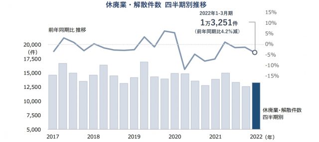 2022年1-3月に全国で休廃業・解散を行った企業(個人事業主を含む、速報値)は1万3251件(前年同期比4.2%減)となった。ただし、資産が負債を上回る割合は前年同期を下回る63.3%。利益が黒字かつ資産超過の健全企業が占める割合も6.6%に止まり、前年同期を下回る水準が続いている。