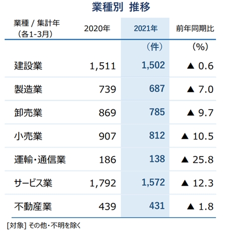 業種別では、全7業種で前年同期を下回った。ただし、建設業は前年同期の1511件から1502件、不動産業は439 件から431 件と、減少幅が非常に小さく、ほぼ横ばいで推移した。「建設業では内装工事や土木工事など、不動産では土地賃貸業などでそれぞれ増加傾向が目立っており、今後業種全体でも底打ちから増加に転じる可能性がある」としている。