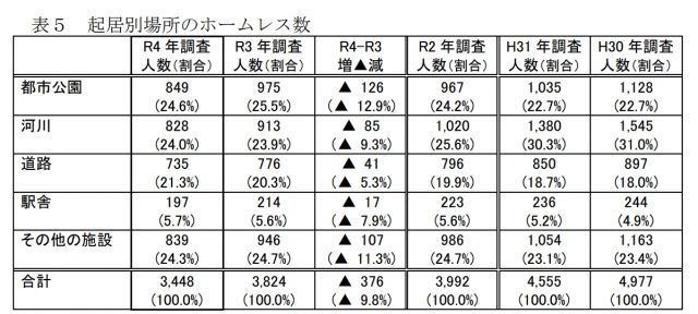 起居別場所の状況(表5)については、いずれの場所で減少。各場所の割合は、前年度から大きな変化は見られなかった(「都市公園」24.6%、「河川」24.0%、「道路」21.3%、「駅舎」5.7%、「その他施設」24.3%)。