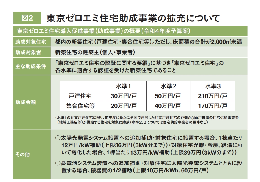 各水準に適合した場合の助成金は、戸建て住宅の場合、1戸あたり水準1で30万円、水準2で50万円、水準3で210万円となる(図2)。さらに太陽光発電システムについても一定の基準を満たせば追加補助が受けられる。