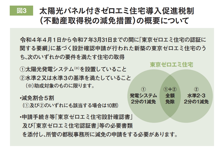 また助成対象となる住宅に対して、①太陽光発電システムの設置、②水準2または水準3の基準を満たしていることを条件に、不動産取得税の減免措置を受けることも可能(図3)。そのほか、国補助事業である「こどもみらい住宅支援事業」や「地域型住宅グリーン化事業」との併用ができる方向で検討が進められており、合計すると最大500万円を超える助成になる可能性がある。