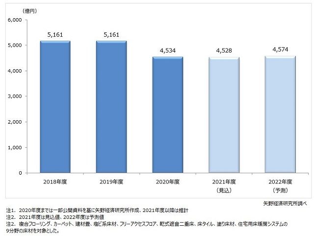 矢野経済研究所(東京都中野区)は5月9日、国内の床材市場(複合フローリング、カーペット、建材畳、塩ビ系床材、フリーアクセスフロア、乾式遮音二重床、床タイル、塗り床材、住宅用床暖房システムの9分野)の調査結果を発表した。2020年度の市場規模を、前年度比12.1%減の4534億円と推計した。コロナ禍の影響で住宅・非住宅の着工件数が減少したことに連動し、9分野全ての床材で前年度比マイナスとなった。