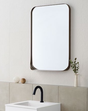 あわせて、四隅を丸く仕上げた壁付け鏡「アールミラー」を発売した。フレームには経年変化した金属をイメージしたエイジドメタル調の2色(グレー、ブロンズ)を設定。フレーム下部は小物置きとして使えるよう奥行を80mmにした。