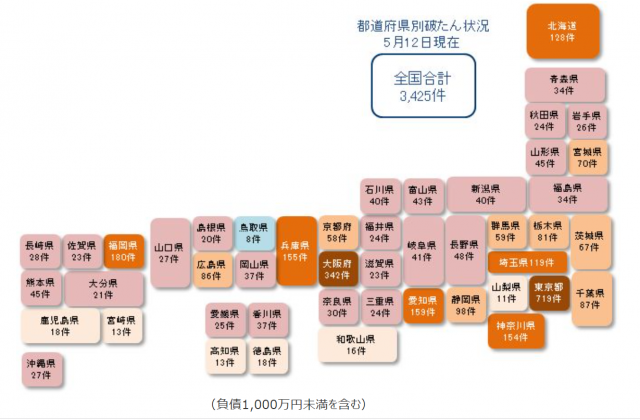 東京商工リサーチ(東京都千代田区)は5月12日16時時点で、新型コロナ関連の経営破たん(負債1000万円以上)が、全国で累計3258件にのぼると発表した。月ごとの件数は4月まで100件超えが15カ月続いているが、5月は12日時点ですでに51件となっており、深刻な状態が続いている。倒産集計の対象外となる負債1000万円未満の小規模倒産は累計167件判明。この結果、負債1000万円未満を含めた新型コロナ関連破たんは累計で3425件に達した。