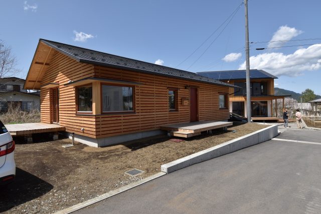 規格型住宅のモデルハウスとして活用するオーナー邸。外壁は透湿防水シートの上にスギ板をファサードラタンに張ったシンプルな仕上げ。コンパクトでシンプルなつくりにすることで、コストを抑えながら高い性能を実現している